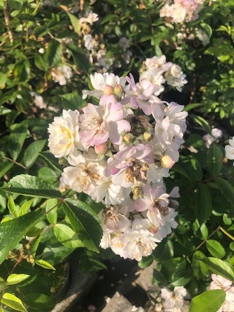 Doorbloeiende klimroos van het Moschata-hybride type. Bloeit met kleine geurende witte dubbele bloemen in trossen. Groen blad met een gele schakering. Wordt niet hoger dan 1,5 tot 2 meter. Deze kan dan ook als heesterroos gebruikt worden. Voor volle zon.