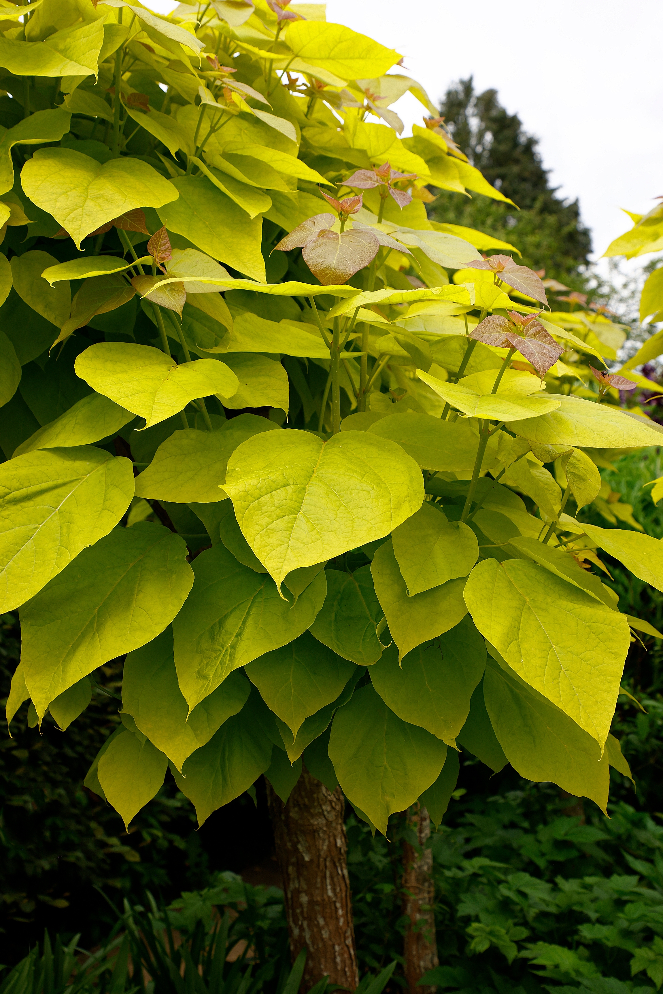 Matig tot sterkgroeiende struik of boom met grote hartvormige bladeren. Het jonge blad is goudgeel en verkleurt geleidelijk geel-groen. Mag eventueel jaarlijks in de lente (zeer) kort teruggesnoeid worden. Niet voor natte grond geschikt !