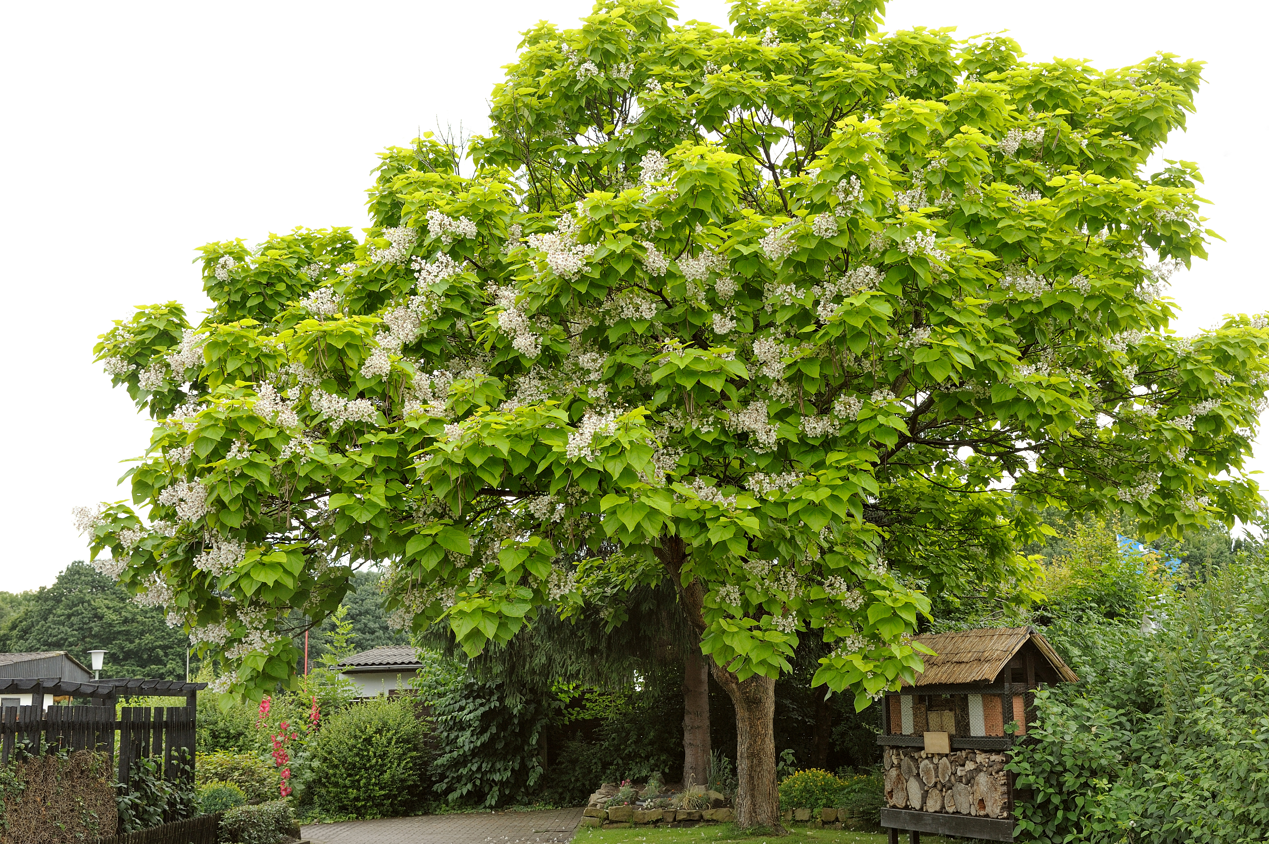 Breed groeiende boom met zeer grote handvormige lichtgroene bladeren. Oudere bomen bloeien in juli-aug. met grote trossen klokvormige witte bloemen. Verdraagt goed regelmatige strenge snoei. Niet voor natte grond geschikt !